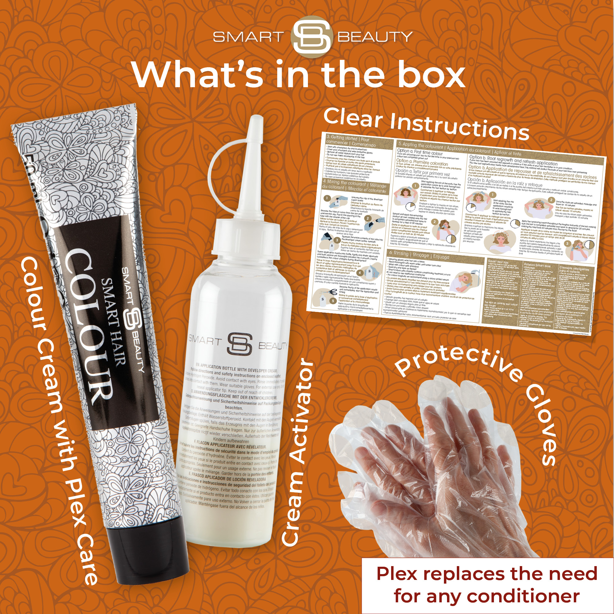 50ml Colourant, 75ml developing lotion, gloves, and instructions. Smart Beauty products are made in the EU.